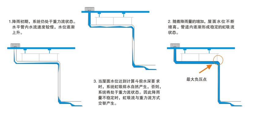 虹吸屋面雨水排放系統根據雨量不同分為不同的階段虹吸屋面雨水排放系統采用特殊設計的雨水斗,使雨水在天溝非常淺的水深下,可以在管內形成滿流狀態。由于建筑高度和落水所具有的勢能,使管道產生局部真空,使雨水斗和水平管內的水流產生附加壓力,形成虹吸現象。